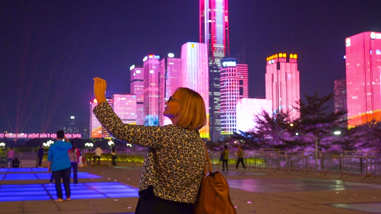 福田中央ビジネス街で行われたライトショーの写真を撮る訪問外交官。写真:林松濤