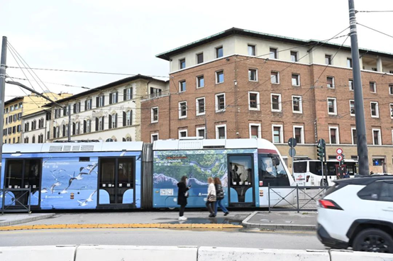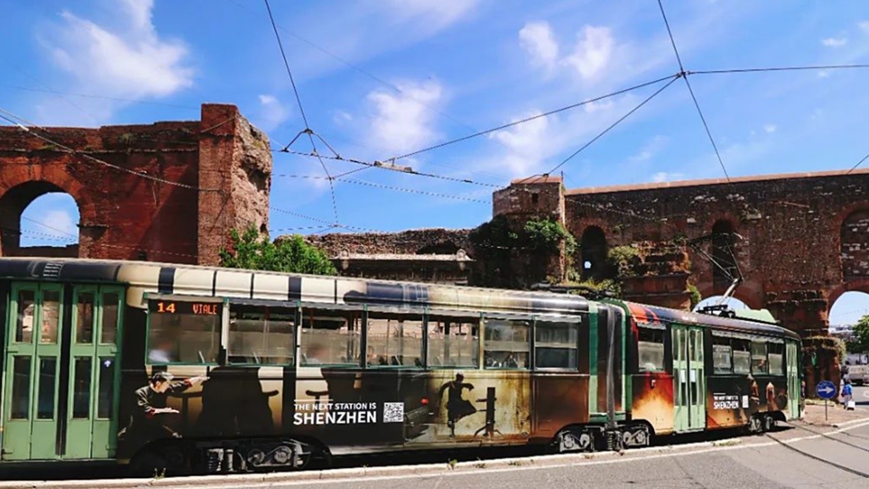 イタリアにある深センの自然景観の映像が描かれた路面電車。