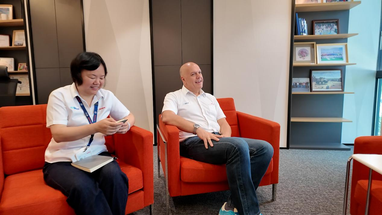 龍崗区にあるボッシュ深セン工場の周芳(周芳,中文不用翻译)営業部長とイタリア人のマルコ・モレア工場長は、深セン日報のインタビューに回答。写真:林建平